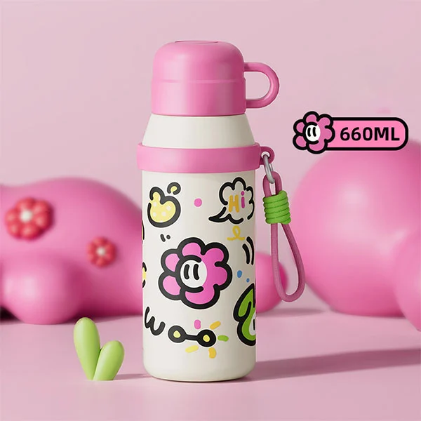 Tämän lasten ruostumattomasta teräksestä valmistettujen sarjakuvapullojen kapasiteetti on 660 ml.