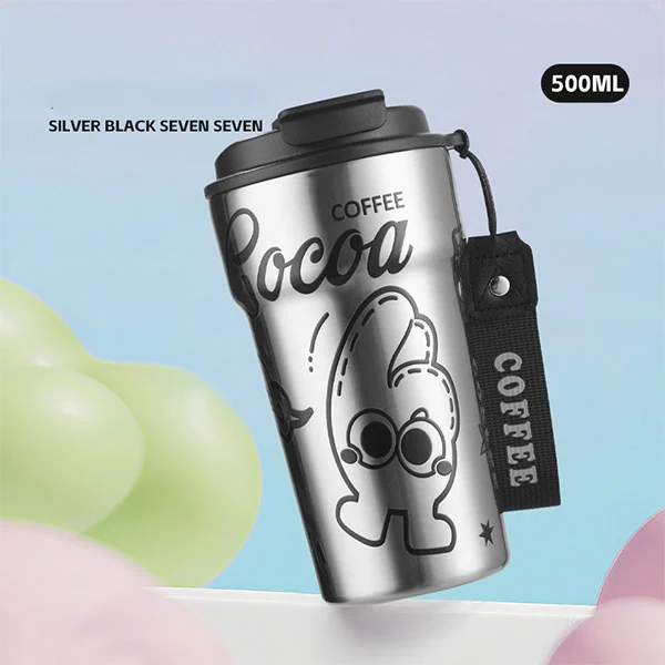 Tämä on ruostumattomasta teräksestä valmistettu tyhjiöeristetty kahvikuppi, jolla on korkea ulkonäkö.