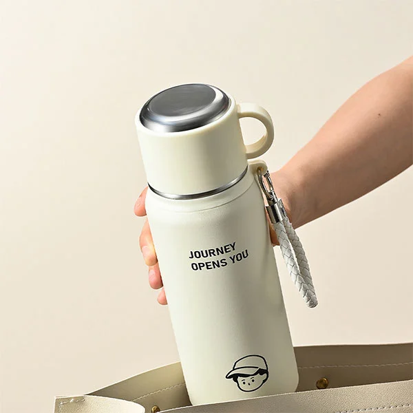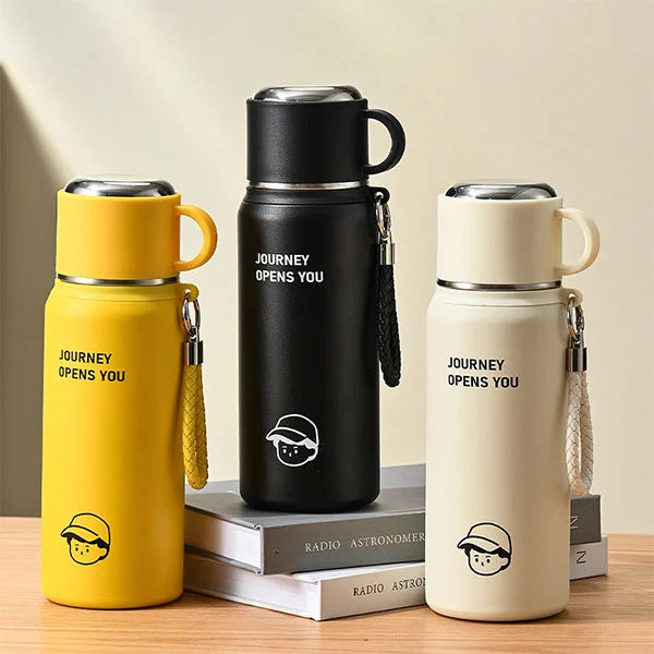 Kansi -osa: PP -kansi plus ruostumattomasta teräksestä valmistettu kansi. Ruostumattomasta teräksestä valmistetun kannen yläosaa voidaan käyttää yksin pienenä kuppina. Suljettu kansi-osa on kaksoisjuoksu kansi. Yksi kytkin voidaan painaa avataksesi sen suoraa juomista varten, jolloin vesi pääsee pieneen kuppiin samanaikaisesti. Toinen painike voi avata olkiosan juomavettä varten oljen läpi.