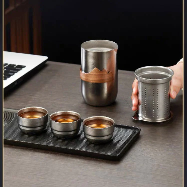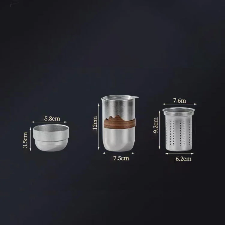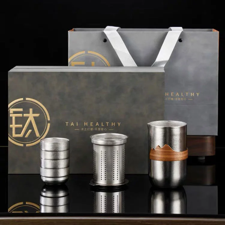 Tämä on teesarja ulkona, se on valmistettu titaanista ja pakkaus lahjojen laatikolla. Neljä pientä titaanikuppia, yksi iso Titaniunm -kuppi ja yksi nahkakotelo. Neljä pientä kuppia voidaan sijoittaa helposti suuren kupin sisälle, ja sitten iso kuppi voidaan laittaa pussiin. Yksi tasku riittää pitämään kaikki työkalut. Anna sinun nauttia vahvasta alkoholista ulkona ystävien kanssa rento tavalla.