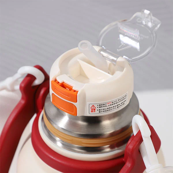 Kolmivaiheinen kupin kansi on varustettu uudelleenkäytettävällä pillillä, joka helpottaa siemailua, ja leveällä suulla, joka helpottaa juomista. Nautimme erityisesti pillien käytöstä ajon aikana; Tämän termospullon avulla voit helposti kohdistaa katseesi tielle samalla kun nautit juomastasi. On huomattava, että kupin kannen pyörivä laite ei ole tiivis, eikä tämä kupin kansi ole täysin tiivis.